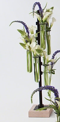 Novel interpretation of industrial flower design, each stand has adjustable rings which hold glass test tubes Powder-coated black stand sits on a desert sandstone base Note: Product may ship compressed - Primping of branches or leaves may be required to match the image shown